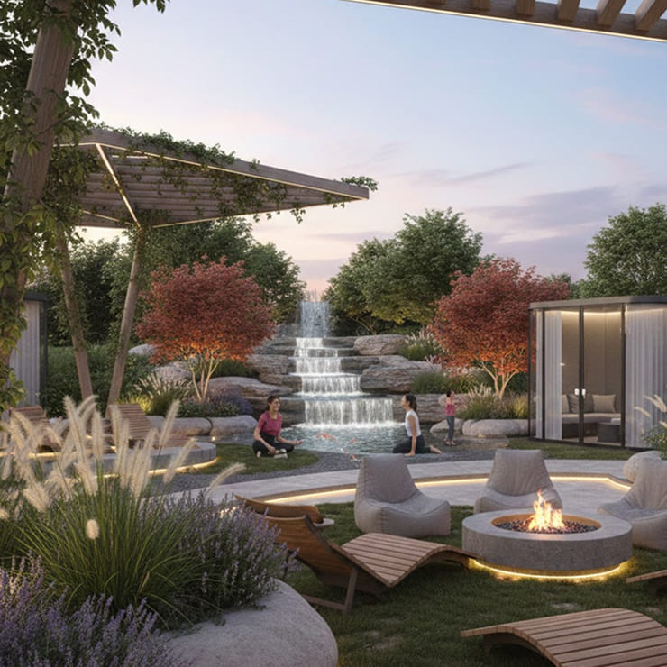 Healing Grove is the calming, healing, and rejuvenating center of Vanam – E5 World. Conceived as a purposeful wellness zone, it is designed to help residents slow down, breathe deeper, and reconnect with themselves through nature.